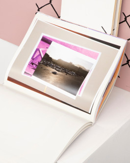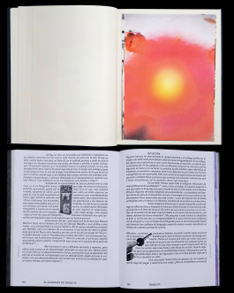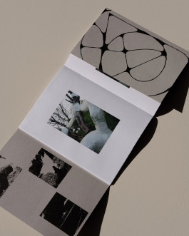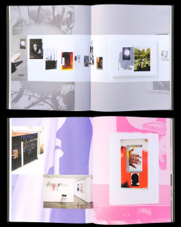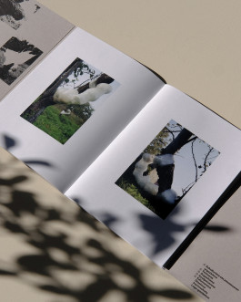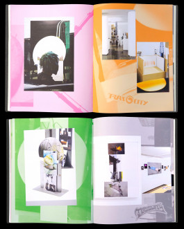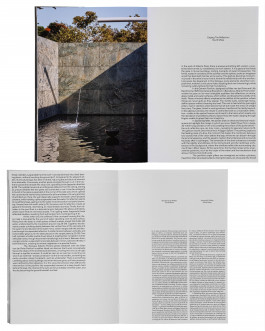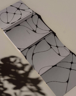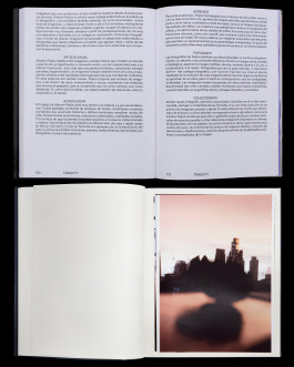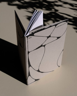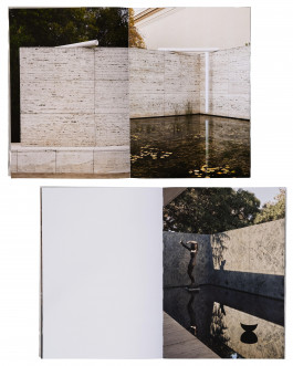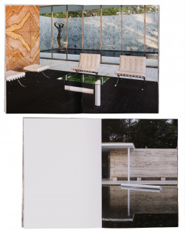 is a publication that gathers the intervention by artist Alberto Peral in the Mies van der Rohe Pavillion in Barcelona, designed by Mies van der Rohe and Lilly Reich for the 1929 Barcelona International Exhibition. As silently playful as the installation, the publication establishes cues guiding the reader into its own tricks and happenings. A reflective surface, an upside-down title, pillar-like typography and thin materials.
